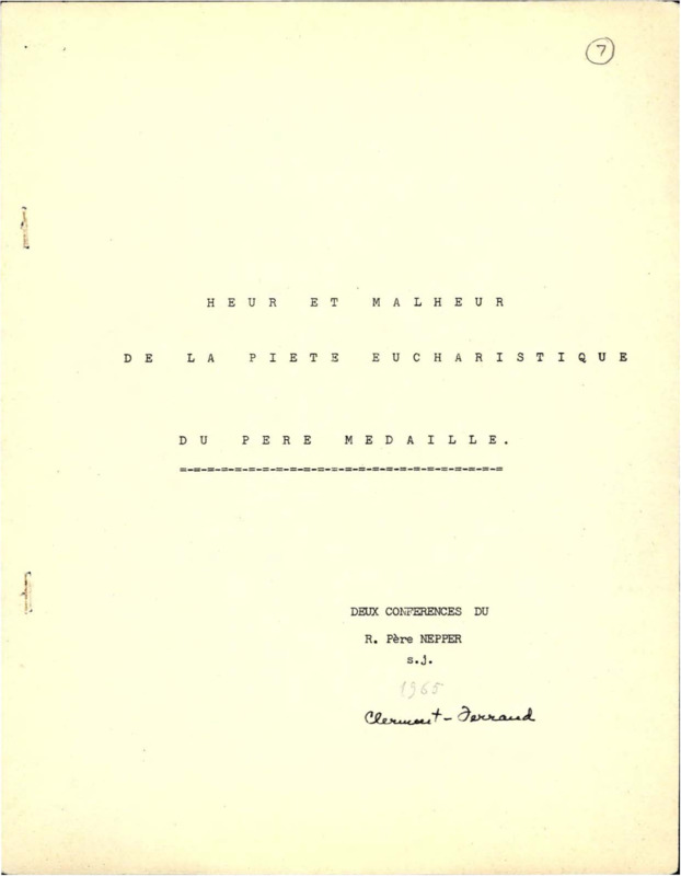 French conference paper translated to 'Fortune and Misfortune of Eucharistic Piety of the Father Medaille.' for the Nepper conference. Title page has a name notation on the bottom right corner.