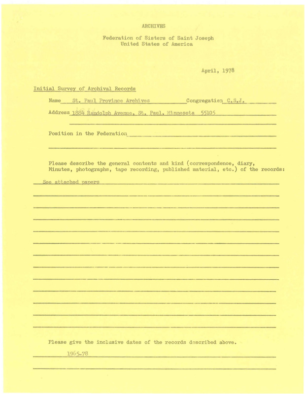 Initial Survey of Records for St. Paul Province Archives