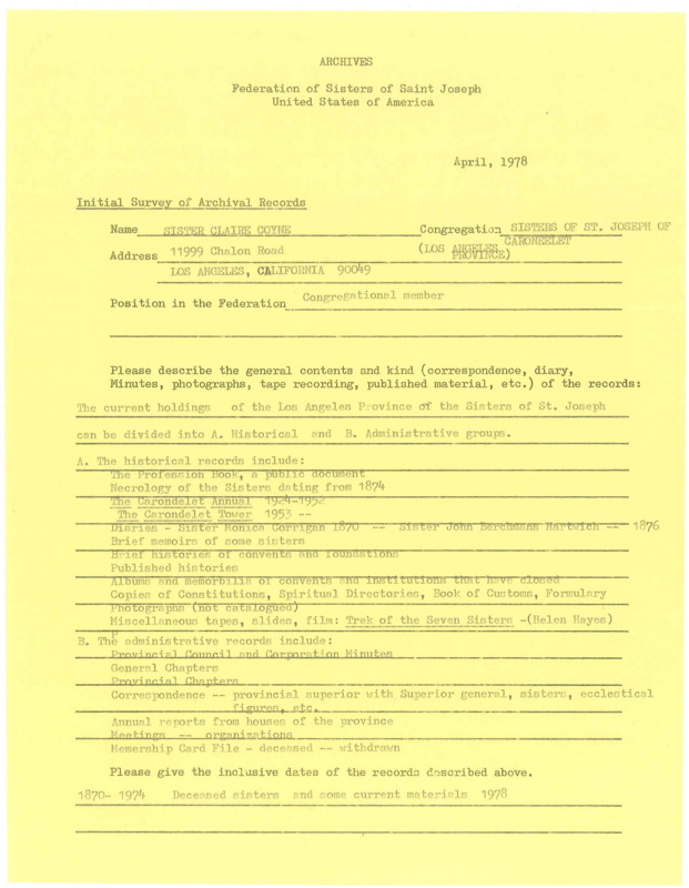Survey of Archival Records for Los Angeles Province of the Sisters of Saint Joseph of Carondelet