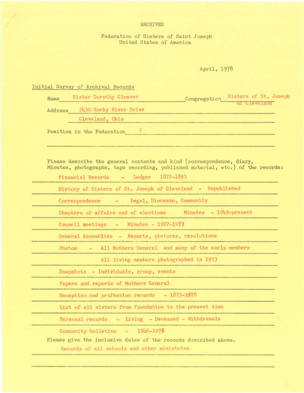 A survey of the materials that the Sisters of Saint Joseph of Cleveland could offer the Federation Archives.