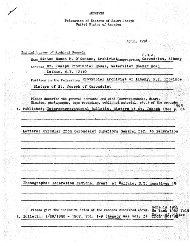 A survey of materials that the OSJ Congregation of Albany could offer to the Federation Archives.