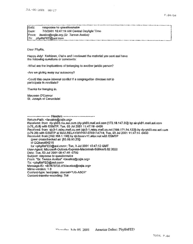 Page 04/04 of a Fax Sent by Phyllis Manda to Barbara Baer with questions about the Federation becoming a "Juridic Person".